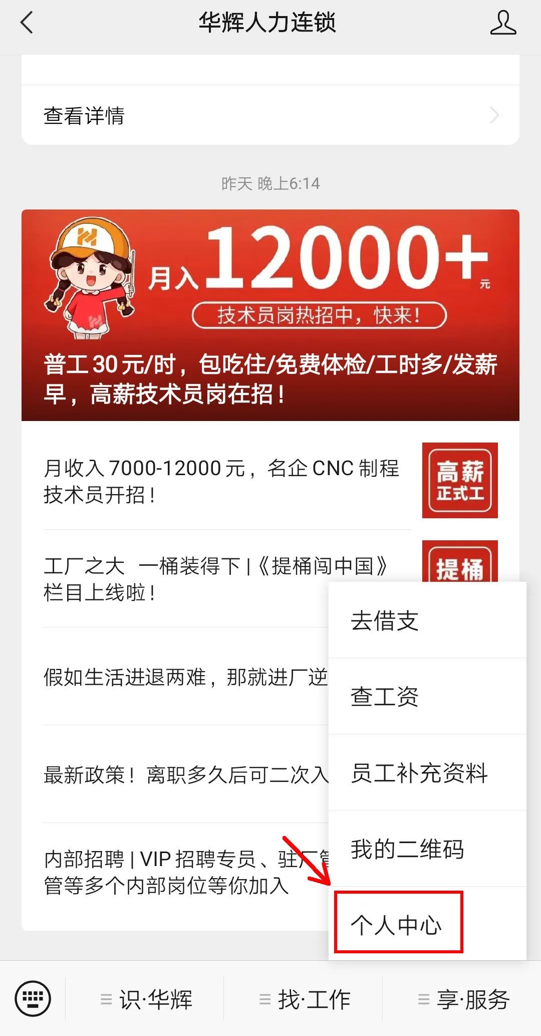 ①扫码关注“华辉人力连锁”服务号