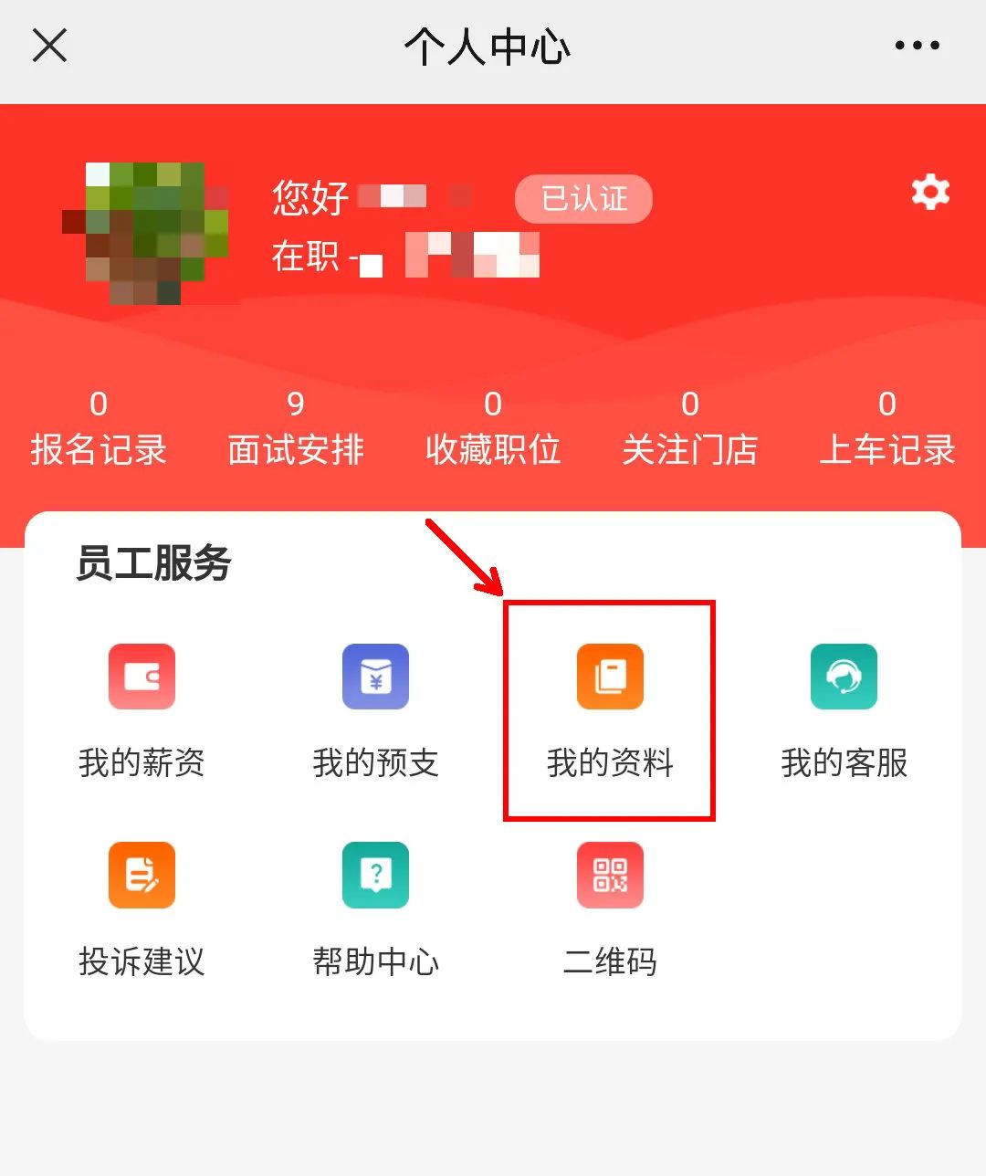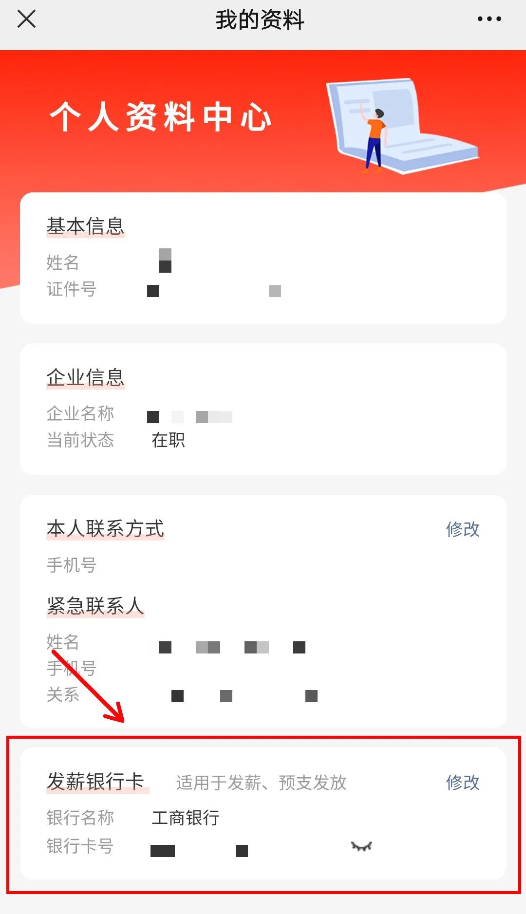 ④在个人资料中心下方找到“发薪银行卡”